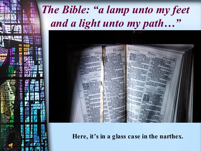 Back at the home church, Bethesda-by-the-Sea Episcopal Church, there were only two around: one for the use of the lay readers and the other, an antique Bible, in a glass case in the narthex, shown below.