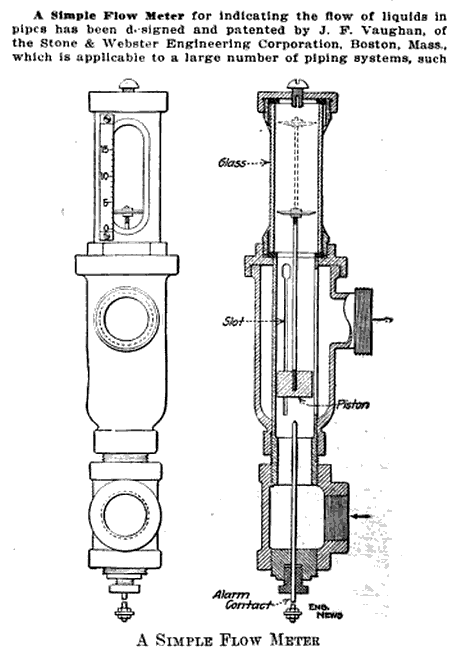 As flow meters go, classical flow meters are not as common as they used to be to measure flow. We think of other methods as “new” but the Rotameter was first patented in 1908. At the right is a variation of the concept dating from 1914. Rotameters are still very commonly used, although their accuracy can be highly variable. Today we have devices such as paddle wheel and magnetic flowmeters to more accurately measure the flow and to report the results to computer controlled systems.