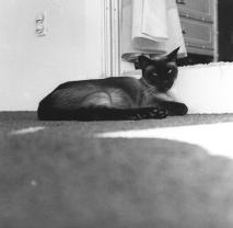 Buff had the delightful habit of running through the house, making a thundering herd kind of noise (this is amazing for animals known for their stealth.) His vision, as is common with Applehead Siamese cats, wasn’t the best, so he didn’t always know where he was going. One night we were sitting around listening to the thundering herd when we heard an unsatisfying thump on the sliding glass door. It seems that Buff, not seeing or caring about the door, had careened into it. He staggered away; he wasn’t himself for several days thereafter.