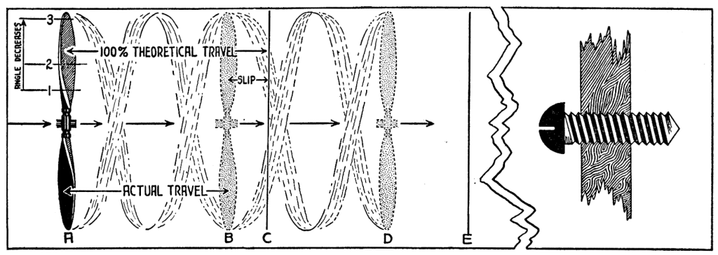 Basically propellers act as a screw in the fluid they’re immersed in, driving the ship or plane forward in a similar fashion as a screw does in a solid. (I can remember that, during my yachting years, the ships’ propellers were referred to as “screws.”) If the fluid is incompressible and everything is “efficient,” then the screw will propel the ship or plane like its solid counterpart. Unfortunately that seldom happens, so there is slip, and the actual travel per revolution of the propeller is less than ideal.