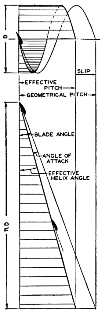 Let’s start by assuming that the propeller profile is not symmetric (and most are this way.) If there is no slip, the angle of attack between the propeller blade and the airflow produced by the propeller is zero, and the blade and effective helix angles are the same.