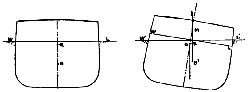 You’ll note that, as the ship rolls from the vertical, the centre of buoyancy comes out from under the centre of gravity, but it’s still under the metastatic centre. At this point we note our basic assumption: that a ship rolling is acting as a pendulum, with the metastatic centre being the pivot point of the swing. (Now you know what the metastatic centre is all about…)