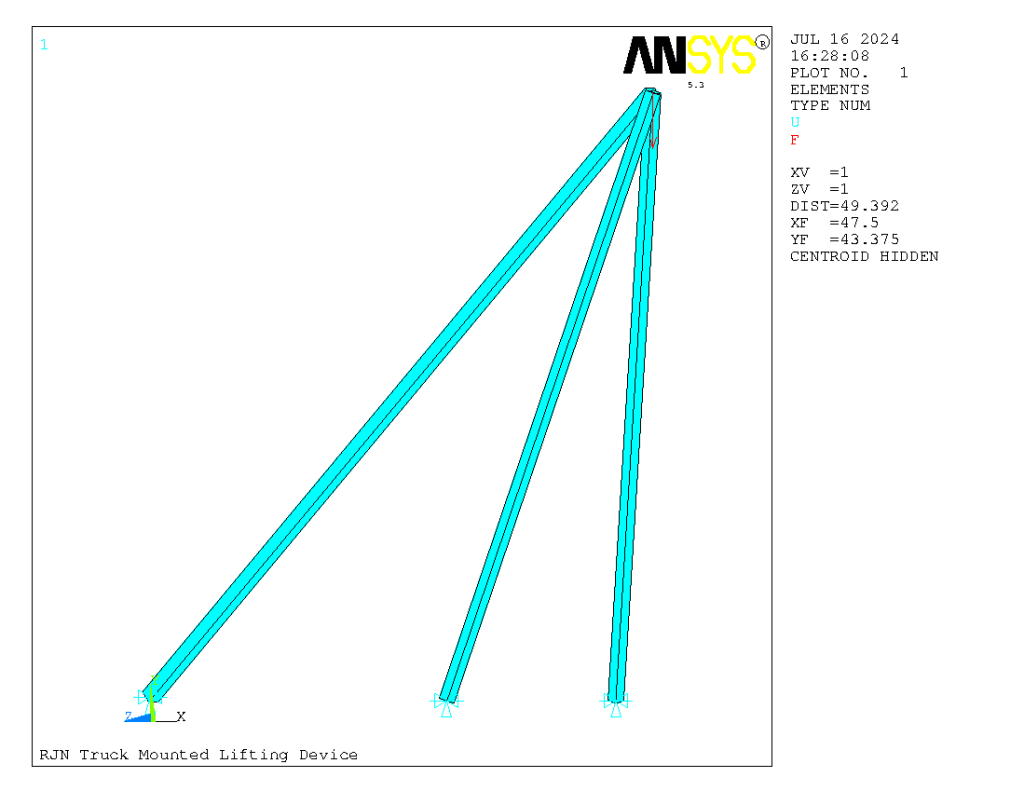 You can see the applied load and the connections. ANSYS rotates the view a little so that you can see the entire model in one view. Since ANSYS prefers actual loads, we will assume a 1000 lb. (1 kip) load at the boom point, which will make comparison with the results from 3D statics relatively simple.