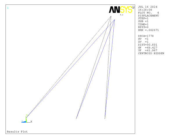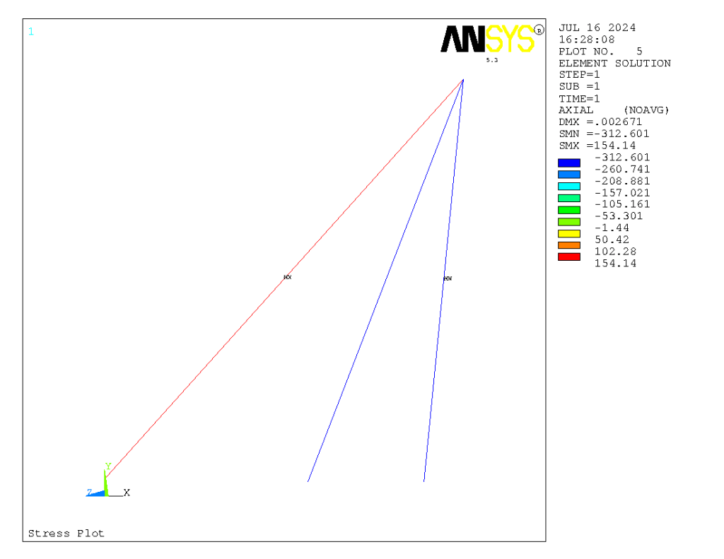 Note that ANSYS uses a more sensible sign convention that we did in the problem. Strut 1 is in tension and Struts 2 and 3 are in compression. (At least we lined up the element and strut numbers!)