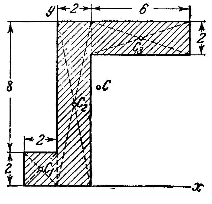 The area and the coordinates of the centroids for each section are noted in the table at the right. Each of these centroids is relative to the coordinate system shown in the diagram above.