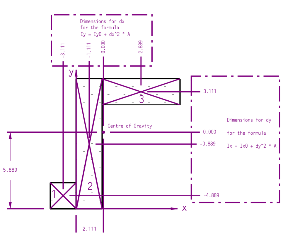 To obtain the result we simply make this transformation for each section and add up the Ix and Iy values that result. This is shown in the table below. The table is split up for formatting purposes.