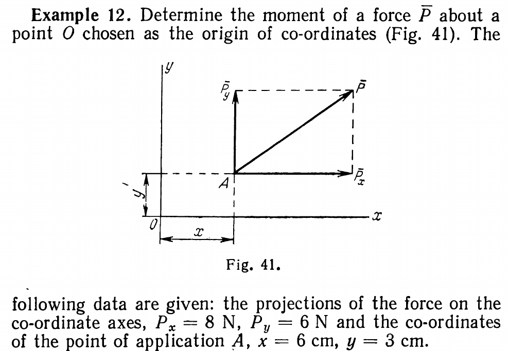 As noted earlier, the moment of any force is the perpendicular (shortest) distance between the force itself. This can be seen above; the line of action is extended downward and its closest point to the origin is 1.2 cm. Since the total force is 10 N, the moment is (1.2)(10) = 12 N-cm.