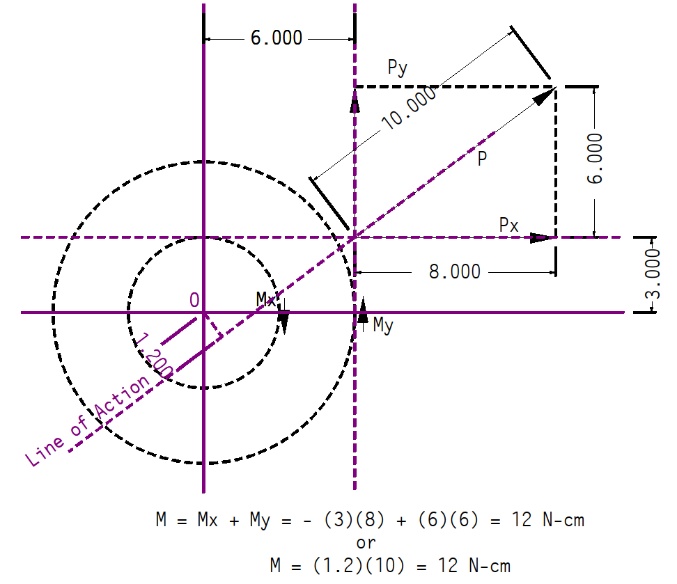 From a graphical standpoint, this is ideal; however, it is not always simple to get to this result without a graphical analysis. The alternative is to take the moments of the x- and y-components of the force times the perpendicular distance from each of these to the center of the moment. This is shown above, where we have two moments (Mx and My) which we add together. Counterclockwise moments are positive, so it is My – Mx = 12 N-cm as before.
