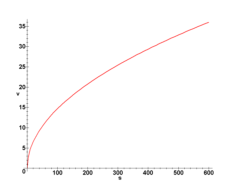Substituting the values of α and r and the midpoint s1 = 300 m, v1 = 25.5 m/sec. It is worth noting that in Theoretical Mechanics – A Short Course -Targ the final answer is different, but earlier it is stated that the midpoint velocity is the final velocity divided by the square root of 2, which gives the same result as we have.
