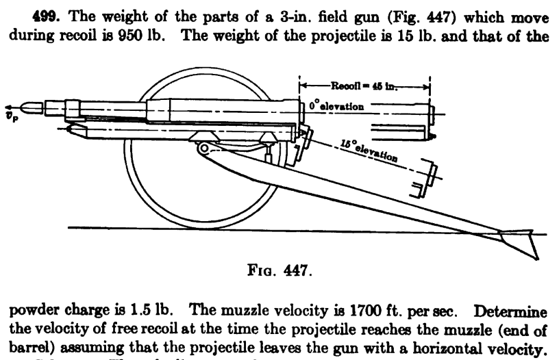 Visitors to this site’s “main” theme know that it centres around my grandfather’s life and career. An important event in his time here was World War I, and one of the things that was central to that conflict was artillery. This problem comes from Seely and Ensign (1921) and concerns artillery and recoil. Artillery is still important, as evidenced by the war in Ukraine, and it’s a fairly straightforward example of the conservation of impulse and momentum.