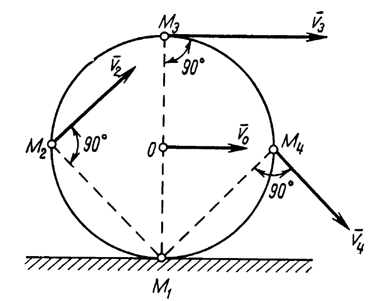 The second example is the Wheel as shown below, rolling without slippage. R = 0.5 m and Vo = 2 m/sec. Find the velocities at points M1, M2, M3 and M4.