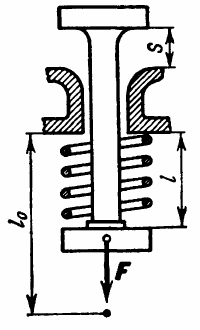 The valve is shown in the open position, when s = 6 mm. The uncompressed length of the valve l0 = 60 mm and the compressed length shown is l = 40 mm. The spring constant for the valve spring is 100 N/m and the mass of the valve is 400 g = 0.4 kg. Determine the velocity at the point when the valve closes (s = 0) starting at the situation where the valve is as shown and the valve is at rest.
