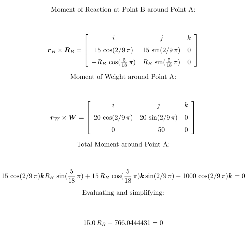 For summation of moments, we take the moments around Point A. This eliminates RA and T from the moment equation. The position vectors of Point B and the point of application of the load have the same unit vector but different lengths. The unit vector is